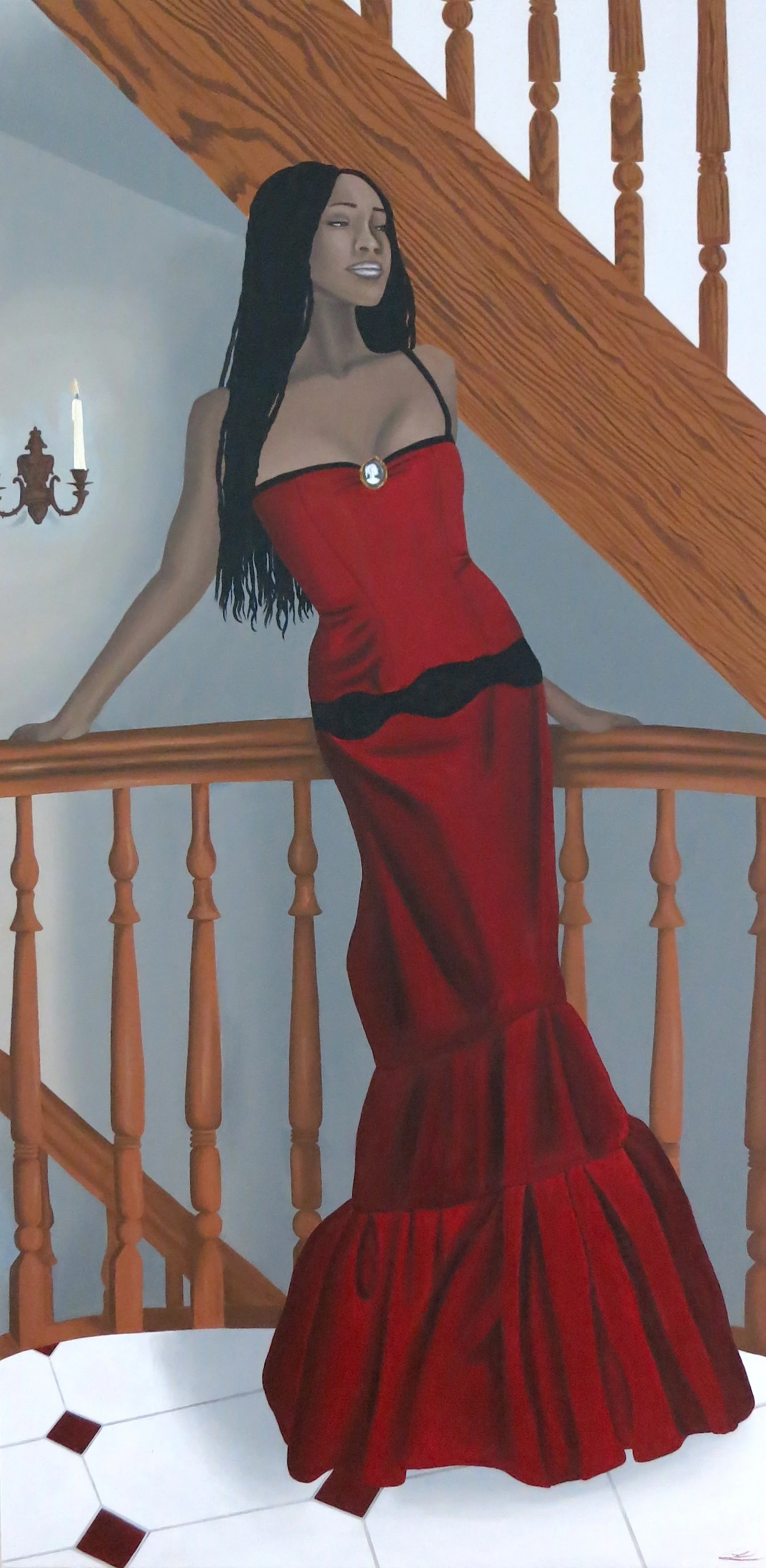 A poised woman in a crimson gown stands on a staircase, blending vintage glamour with modern confidence. The warm interior and dramatic pose create a timeless, elegant atmosphere.